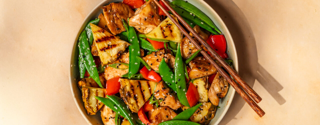 Schep de kip en ananas uit de oven bij de groenten in de pan en laat het geheel nog even kort samen warm worden. Serveer met lente-ui, sesamzaadjes en een beetje limoenrasp.
