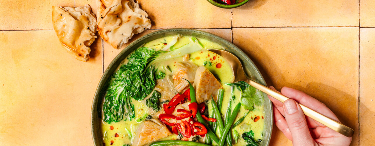 Snel een geurige maaltijd vol smaak en veel verse groenten op tafel? Probeer dan eens deze vega Thaise groene curry met groenten en jackfruit. Kruidig en licht-pittig door de smaken van de groene currypasta, maar ook romig en zacht door de kokosmelk. Maak deze vega groene curry compleet met rijst of noedels. Of geef het gerecht een Indiase twist en combineer met naanbrood. Eet smakelijk!